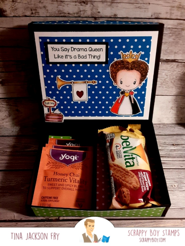 Off with their Heads is one of the Wonderland sets from Scrappy Boy Stamps. I thought it would go well with a tea and cookies treat box .Used the matching dies and colored with pencils. https://scrappyboy.com/collections/wonderland-release. Inside of the box. Hope you check out the Scrappy Boy Stamps Inspiration page on Facebook.