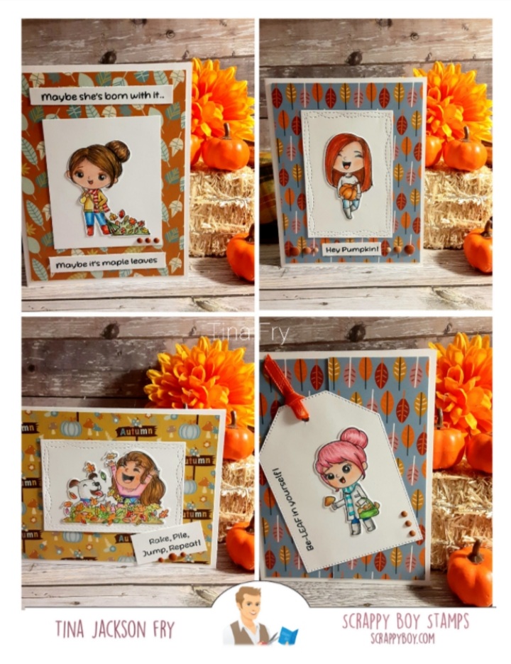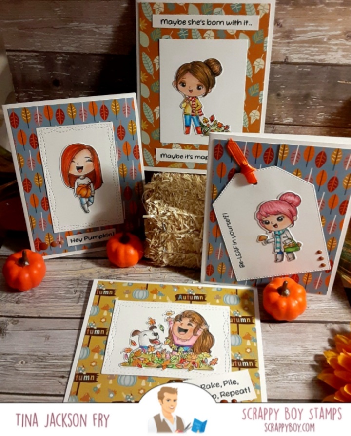 Fall Gnomes is one of the new sets from this month’s new release at Scrappy Boy Stamps. Matching dies are also available along ×ith coordinating paper. Cool new dies and the Cute Girls Fall Leaves are new this month. Made a candy box with Fall Gnome images. Colored with Prisma Premier Pencils. Hope you join the fun on Facebook with the Scrappy Boy Stamps Inspiration Group page, Scrappy Boy is also on Instagram. https://scrappyboy.com/pages/september-2022-releaseI used the new Wonky Stitched Die on these cards. Love the detail on these dies. Colored with Prisma Premier Pencils. They are A2 size cards with the coordinating papers.