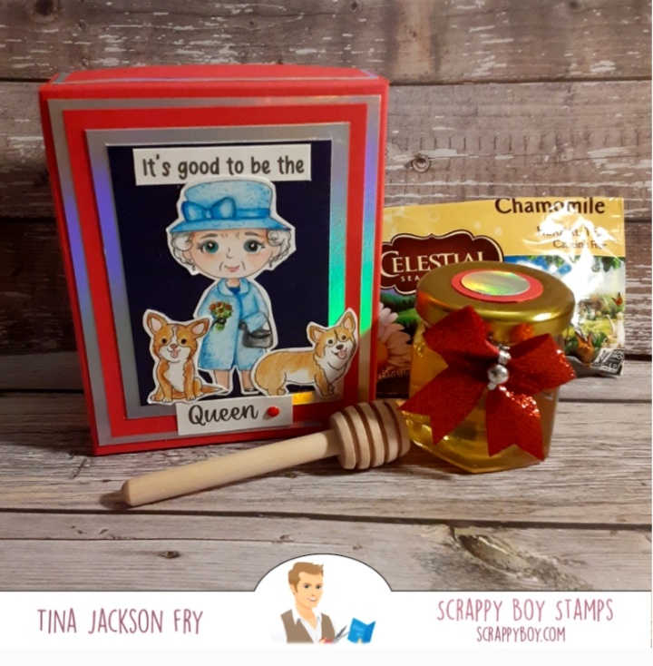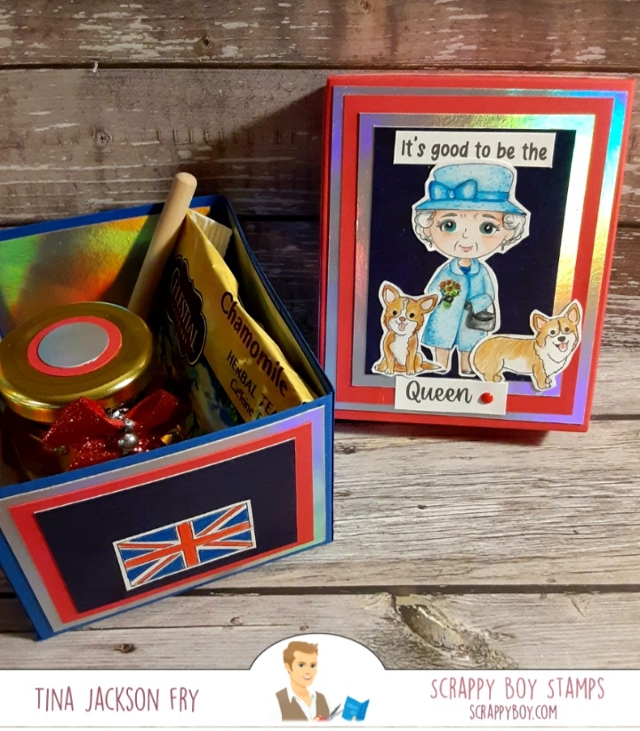 This card was made using a lot of sparkle stickers. (The Union Jack flag is from Kindred Stamps. ) there is a Union Jack stamp that comes with the set. There is also a Princess Diana stamp along with other images and sentiments. Hope you join the fun on Facebook with the Scrappy Boy Stamps Inspiration Group.