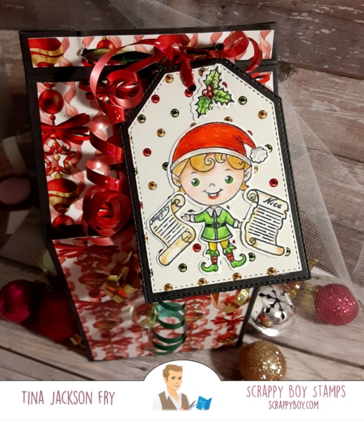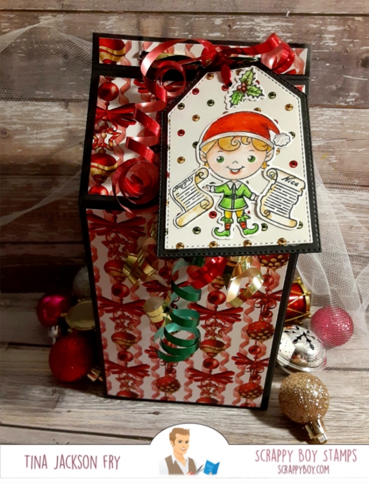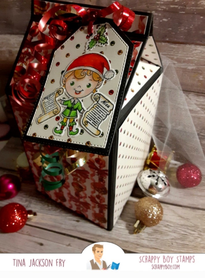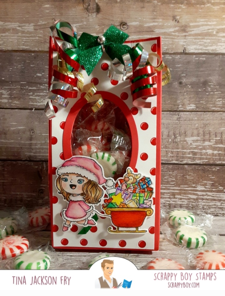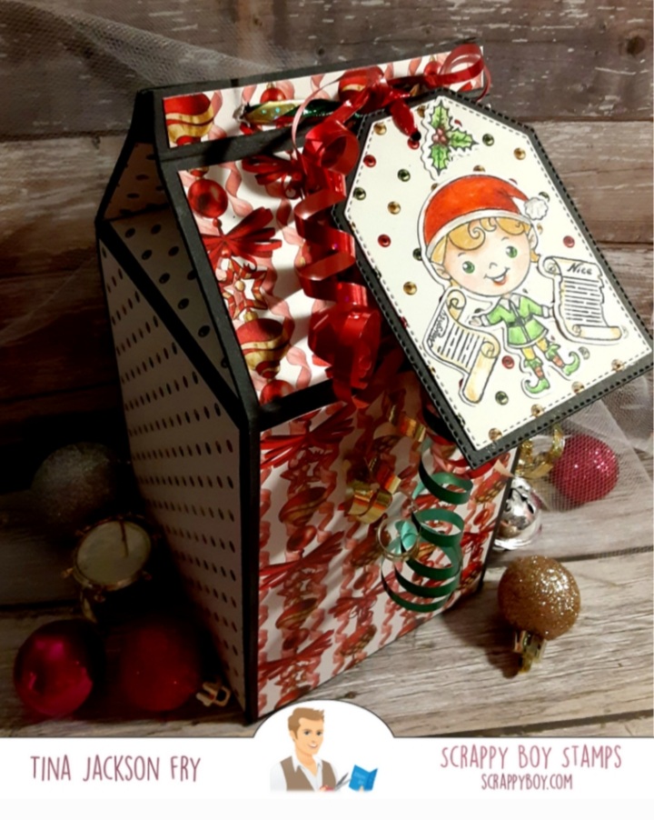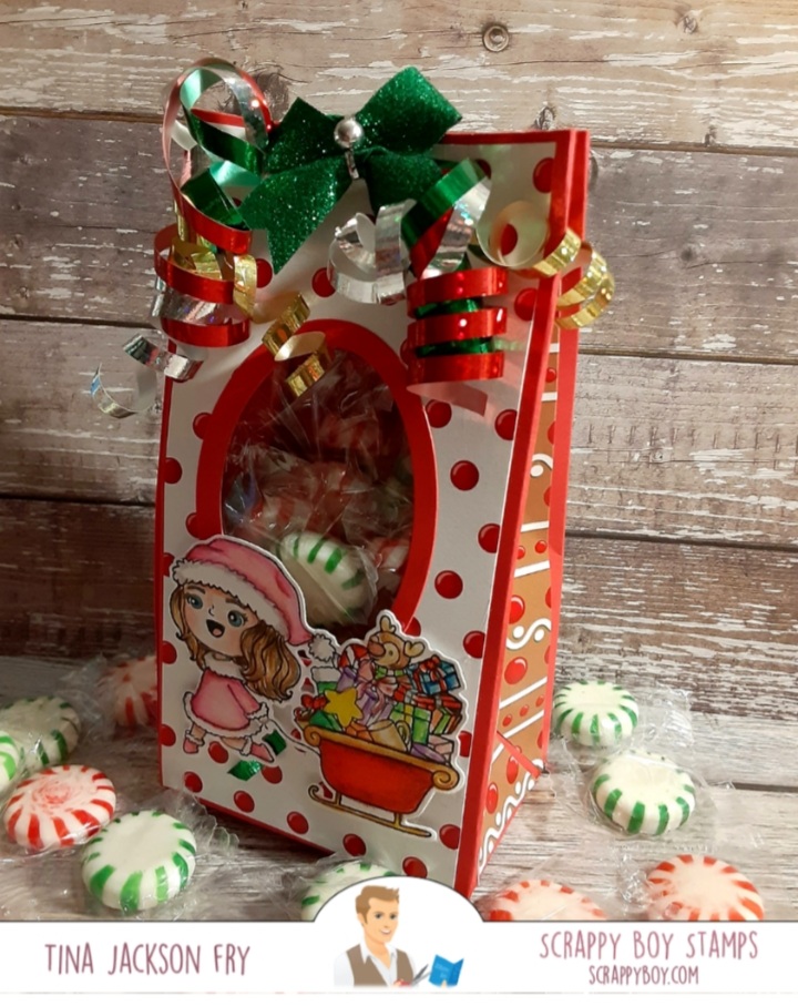 Hi, I made this milk carton style gift box using the gorgeous paper from the new release at Scrappy Boy Stamps. The images are from the new 6×8 stamp sets Naughty List and Nice List. They have matching dies available. The tag dies are also part of the Scrappy Boy line. Colored it with Prisma Premier Pencils. With this release a Cute Girls set is also available. For more fun you can join the Scrappy Boy Stamps Inspiration Group page on Facebook. https://scrappyboy.com/pages/october-2022-releaseMade this gift bag with an image from Cute Girls Merry and Bright. Matching dies and coordinating paper packs are also available. The bag was made with the WRMK bag punch board. I also included instructions if you don’t have the board.