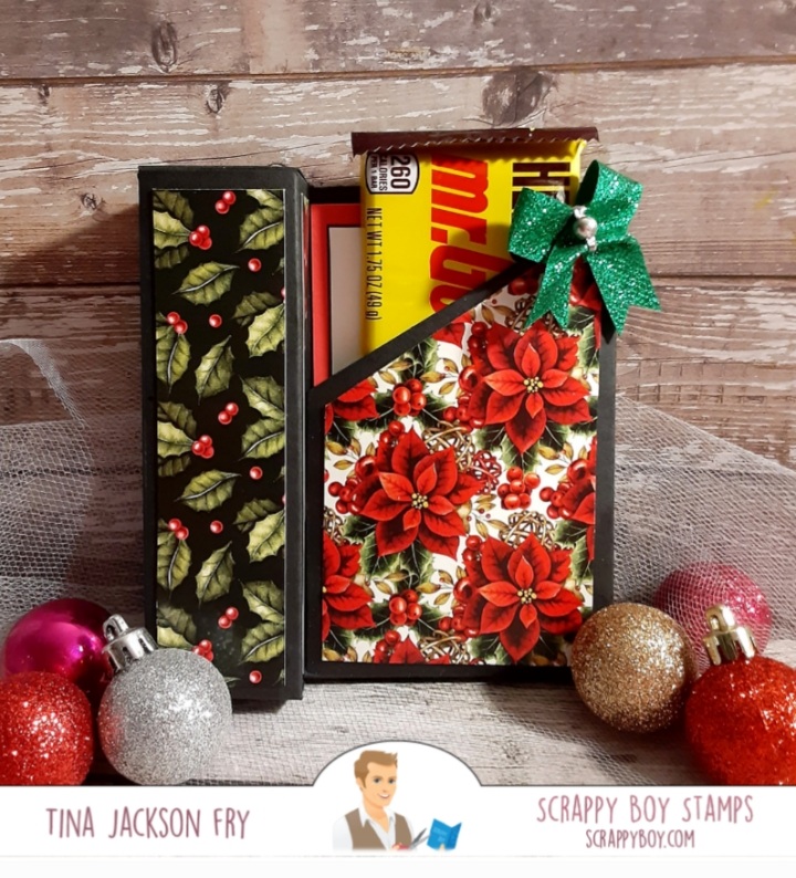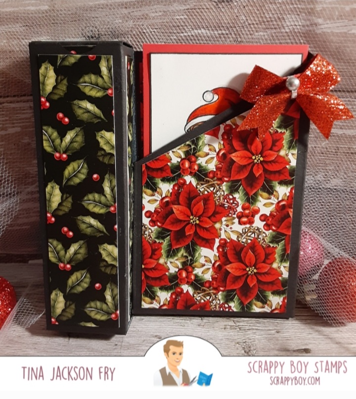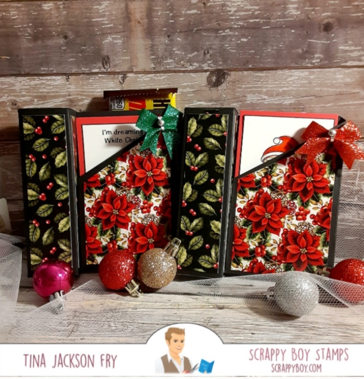 This i@ a gift box/card all in one. I used Stamps from the new release at Scrappy Boy Stamps. This release is so fun. Two 6×8 sets Naughty List and Nice List with matching dies available. Coordinating paper too. The Cute Girls set is awesome. Hope you join the fun on Facebook with the Scrappy Boy Stamps Inspiration Group page. For the older crafters they may get the reference to the candy bar, lol. The box part can hold candy, lip gloss or other small items. I got the idea from Chicnscratch on YouTube ….Gift Card Treat Box. https://scrappyboy.com/pages/october-2022-release