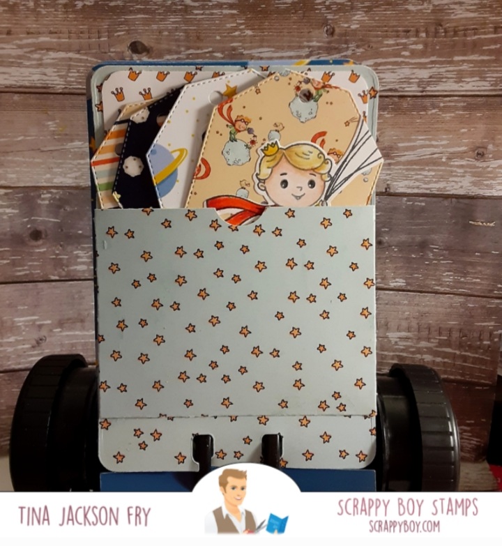 Hi, today I’m sharing some projects made with Little Prince from the new release at Scrappy Boy Stamps. The release goes live tomorrow Friday January 20th. This release is so exciting. It offers Stamps, matching dies, coordinating paper packs for Little Prince and Cute Girls Mardi Gras. A new memory dex die is also available. You can join the fun on Facebook with the Scrappy Boy Stamps Inspiration Group. You will be able to find them by clicking on the link. For my other project I used the Bespelled set.. https://scrappyboy.com/I really like this new Memory Dex die. It is so versatile. It can even be made into a pocket card.You can use velcro or magnetic closures.This pocket is filled with tags. The tag dies are also from Scrappy Boy Stamps. I scored 1″ or a little bigger from the top of the memory dex base card.you can score it after you place the pocket on.This Witch’s broom tag is from the Bespelled set. I used the matching dies to cut it out. The treat box Inspiration is from the YouTube video from Sam Calcott. She shows how to construct the box.You can fill it with candy. I chose butterscotch candies, my daughter’s favorite.