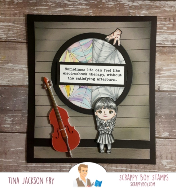 Hi, hope you’re having a great day! Today I’m sharing some projects I made with products from the new release at Scrappy Boy Stamps. The first card is from a 6×8 stamp set from She’s a Dream. Matching dies, coordinating paper packs are also available. The bottle was made by tracing the stencil and cutting it out and piecing it together. Scrappy Boy is on Instagram and Facebook. You can join the fun on Facebook with the Scrappy Boy Stamps Inspiration Group page. To find the new release you can click on the link. https://scrappyboy.com/pages/march-2023-new-releaseThis card features the main character from Goth Girl , a 6×8 stamp set. Matching dies and paper packs, stencils are available. The beautiful stained glass window is also part of the new release. Colored with pencils. For this card I used one of the stencils from this release. Used distress inks with the stencil.