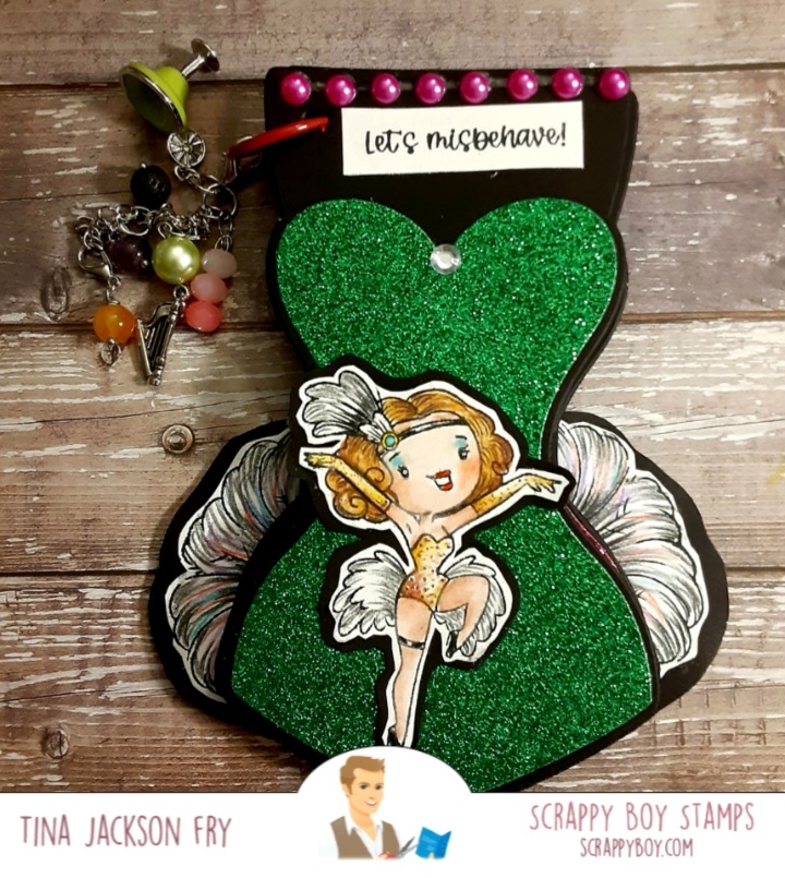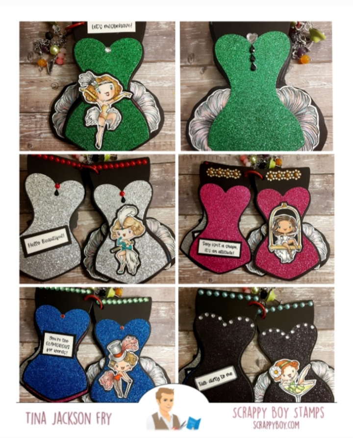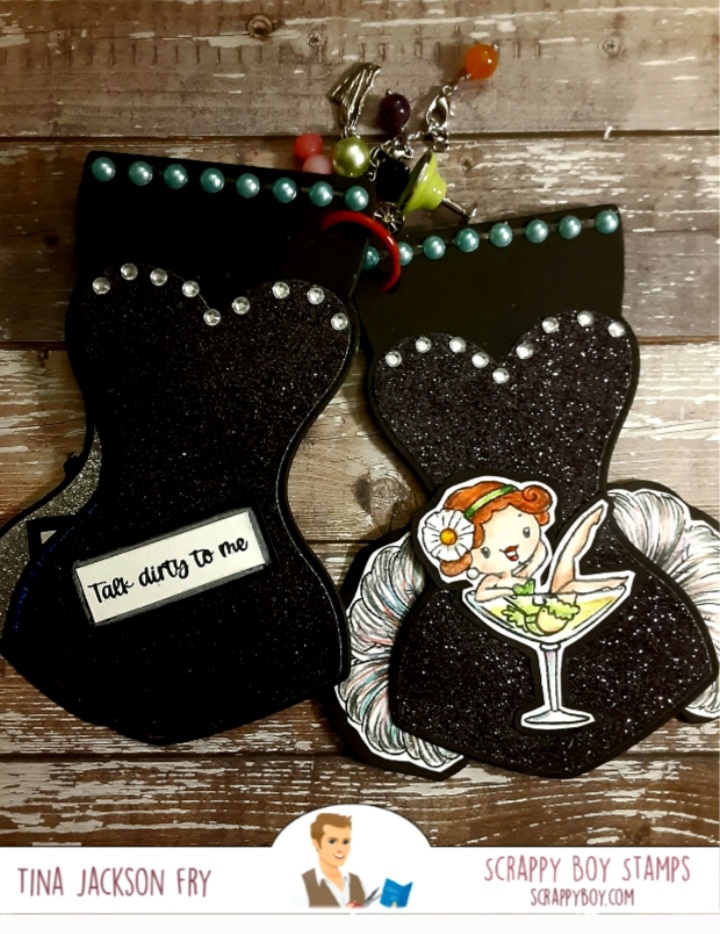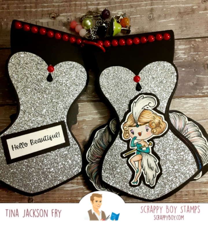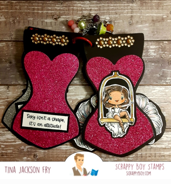 Hi, today I’m sharing a mini album made with stamps and dies from Scrappy Boy Stamps. The corset die is so versatile it’s fun to create with. I used stamps from the 6×8 sets Burlesque Beauties and Curve Appeal. The images are colored with Prisma Premier Pencils. Used a hole punch and ring binder and added the dangle. Most of the glitter paper came from a paper pad from Dollar General. I like it because it doesn’t shed. The base card stock is black Astrobrights. You can join the fun on Facebook with the Scrappy Boy Stamps Inspiration Group page. To find the products you can click on the link. https://scrappyboy.com/I used the fan stamp on the sides.