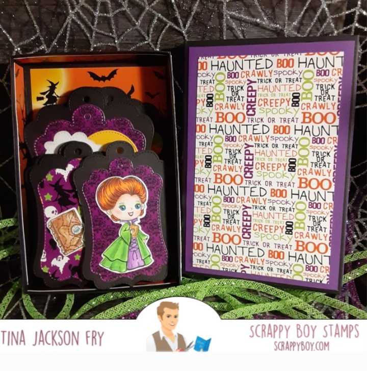 Hi! Hope you’re having a spooktacular day! The new release at Scrappy Boy Stamps goes live tomorrow Friday August 18th. So many new dies, stencils, paper packs, and 3 new stamp sets. I Put a spell on you 6×8, Cute Girls Halloween Pin Up Girls 6×8 and Halloween-Build a Gnome Home 4x 8. I made a boxed tag set. I love the new tag dies. Used the new paper pack on the fronts and backs of the tags and box. You can join the fun on Facebook and Instagram with the Scrappy Boy Stamps Inspiration Group page. To find Scrappy Boy Stamps you can click on the link. https://scrappyboy.com/Inside of the box.Inside view with tags, the Lid is on the right. Cute Girls Halloween Pin Up Girls 6×8 set. Colored with Prisma Premier Pencils. The bookmarks were made with the new Scrappy Boy bookmarks die sets.The bookmarks were put in a cello treat bag with a pokey tool and put the coordinating topper on the bag. I also used the matching dies to cut out the images and the coordinating paper pack.