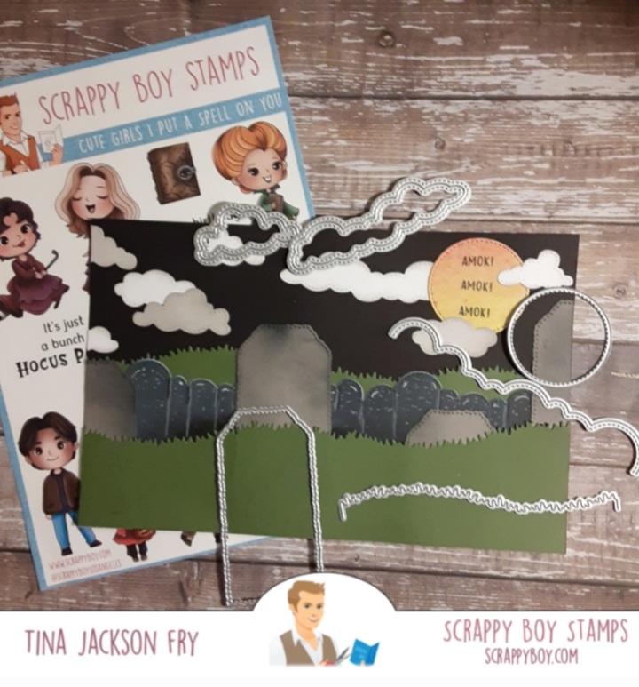 Scrappy Boy has some new cool dies . I used the clouds, stitched circles, grass die, and the new wonky tag dies for the tombstones. To find the dies you can click on the link. https://scrappyboy.com/collections/card-making-dies