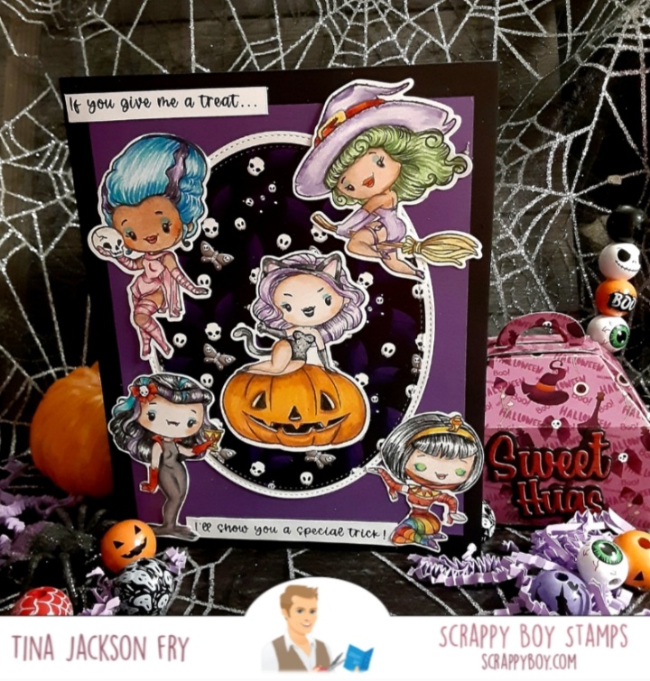 Hi! So excited to share this spooktacular card with you. I used the Halloween Pin Up Girls 6×8 set from ScrappyBoyStamps. This release also has Cute Girls Hocus Pocus, Halloween build a Gnome Home sets, matching dies, paper packs,, and new dies available. Nothing card I also used the new stitched oval dies and paper. To the left of the card is the Scrappy Boy treat box. The images are colored with Prisma Premier Pencils. You can check out Scrappy Boy Stamps Inspiration Group page on Facebook and Instagram. To find the new release you can click on the link. https://scrappyboy.com/pages/august-2023-new-release