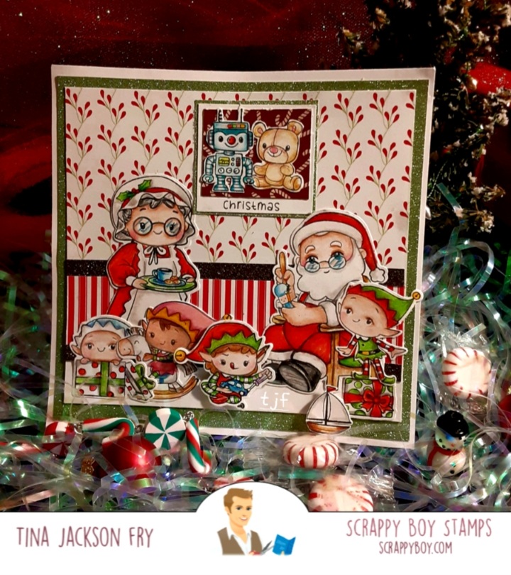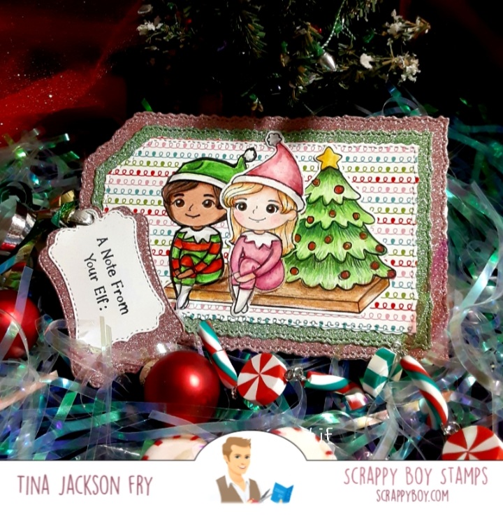 Sneak Peek…. I am excited to share a sneak peek from Scrappy Boy Stamps October release. It goes live tomorrow the 20th. 3 new stamp sets, Santa’s Workshop, Cute Girls Christmas Toys, and Christmas Build a Gnome Home. Stencils, paper packs, dies, pre colored die cuts will also be available. This card is 6×6 featuring Santa’s Workshop was colored with Prisma Premier Pencils. Scrappy Boy is on Facebook and Instagram. To find Scrappy Boy’s releases you can click on the link. https://scrappyboy.com/I used the Torn Edge tag dies with the Cute Girls Christmas Toys set. Colored with pencils.