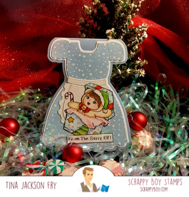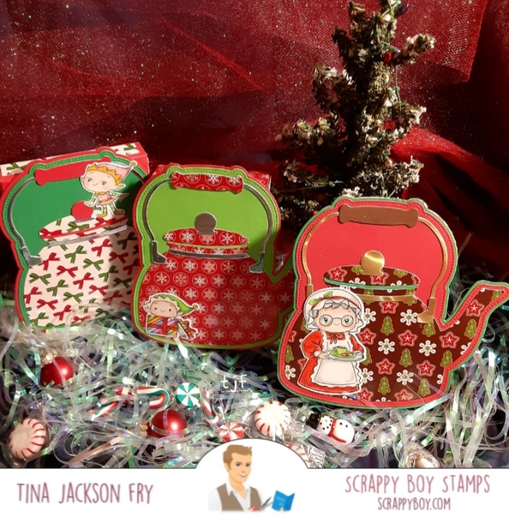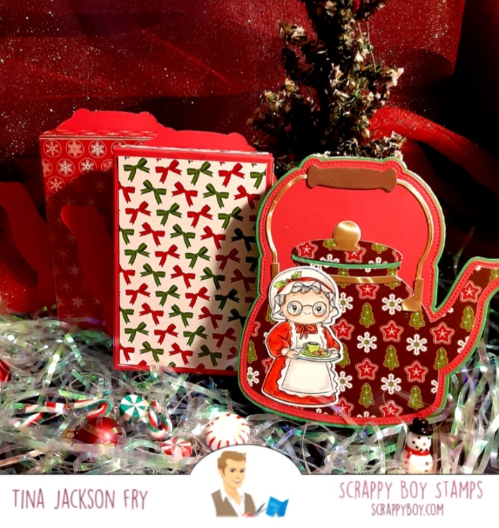 Hi, hope you’re having a great day. Today I’m sharing some projects made with products from the new release at Scrappy Boy Stamps. The release has 3 new stamp sets, Santa’s Workshop, Cute Girls Christmas Toys, and Christmas Build a Gnome Home add on. It also has paper packs, stencils, and dies. The Water Kettle die is part of the new release. Made these into treat boxes decorated with the paper pack. You can find Scrappy Boy Stamps on Facebook and Instagram. To check out the new release you can click on the link. https://scrappyboy.com/pages/october-2023-new-releaseThe box can be easily made wider.Covered he box with with the coordinating paper.then glued it to the back of the Kettle. The image from Cute Girls Christmas Toys was colored with Prisma Premier Pencils. Made a shaped card using the Scrappy Boy Baby Doll Dress die.