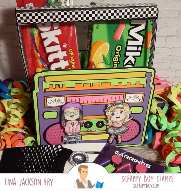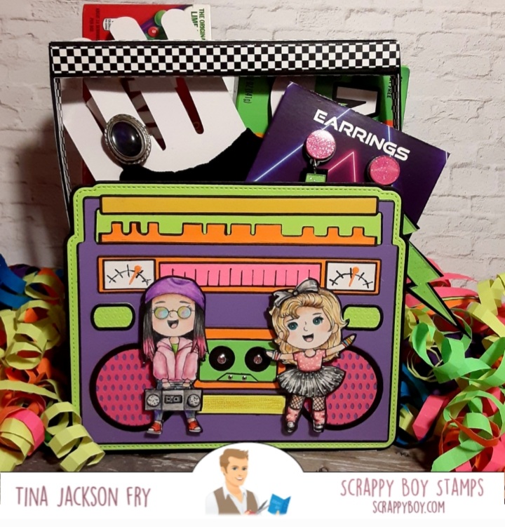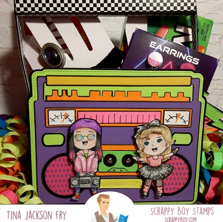 Hi, I can’t even begin to tell you how excited I am to share the November release at Scrappy Boy Stamps. The release goes live tomorrow Friday November 17th. There are 3 new stamp sets, Permanently Punished and Hair Hopper are 5 x 6 1/2, and Cute Girls I Love the 80’s is 6×8. Matching dies, stencils, paper packs, colored die cut pieces are also available. There are a few new dies too, The Hairspray Can mini album, Boom Box, and Build a Stage die set. You can join the fun on Facebook and Instagram with the Scrappy Boy Stamps Inspiration Group. All the images are colored with Prisma Premier Pencils. You can find Scrappy Boy Stamps by clicking on the link. https://scrappyboy.com/Front cover, the words are included with the die set.I love the bug die, it was so fun to cut in all the different card stock colors. Love the attitude, lol.It’s time to DanceMom and PopAt the danceYoung LoveThe show must go on Back cover of the mini album. Some ideas for the Can mini album die set. Cute Girls I Love the 80’s, I made a gift box using the new Boom Box die set. The mood ring is the one I have had since the 80’s. The die set was so fun to create with. My kids were happy to eat the candy. My older daughter took off with the earrings. The musical not stencil is also part of the new release. You can make the box wider and taller.