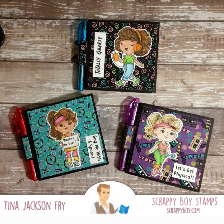 Hi! Hope you are having a great day! Today I’m sharing some projects I made using products from the new release at Scrappy Boy Stamps. Hair Hopper, Permanently Punished, and the Cute Girls I Love the 80’s are 3 new stamp sets. They have matching dies available. Also, the release has paper packs, stencils, a Hairspray Can Die set, a Build a Stage die set, and a really cool Boombox Die set. You can join the fun on Facebook and Instagram with the Scrappy Boy Stamps Inspiration Group. I had a lot of fun making this card. Colored with Prisma Premier Pencils. I love the bug die that is in the Hairspray Can die set. To find the new release you can click on the link. https://scrappyboy.com/pages/november-2023-new-releaseI used the Cute Girls I Love the 80’s to make these post it note holders/with pens. Watched a YouTube video by Crafty Crafts by Deanna … Craft Fair series 2022/SWEET POST IT NOTES. I had the mini pens in my stash. I used pink, blue, and yellow post it pads.