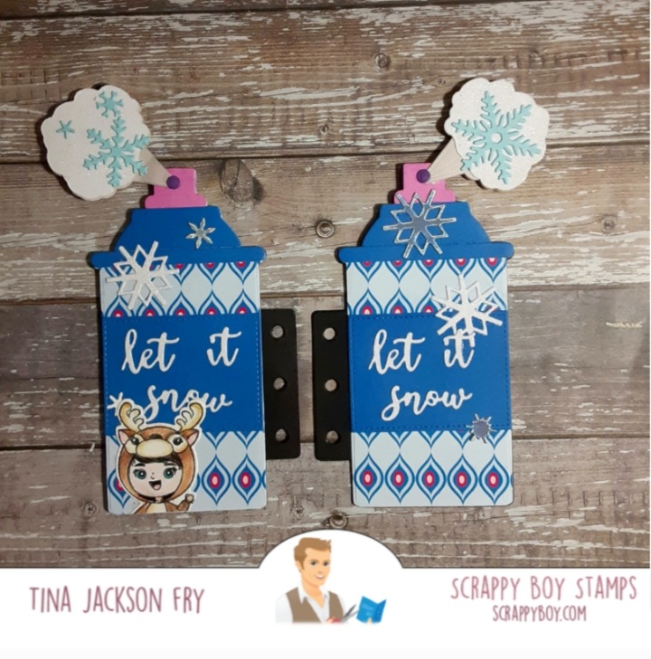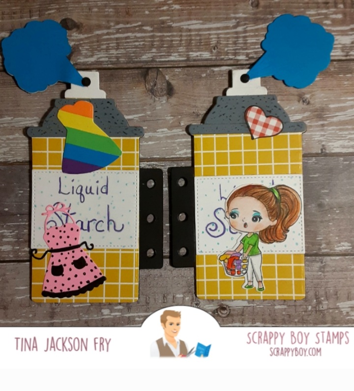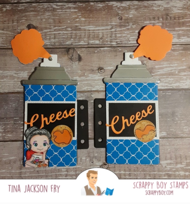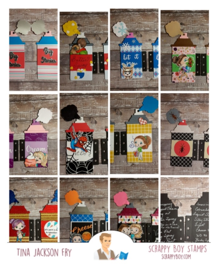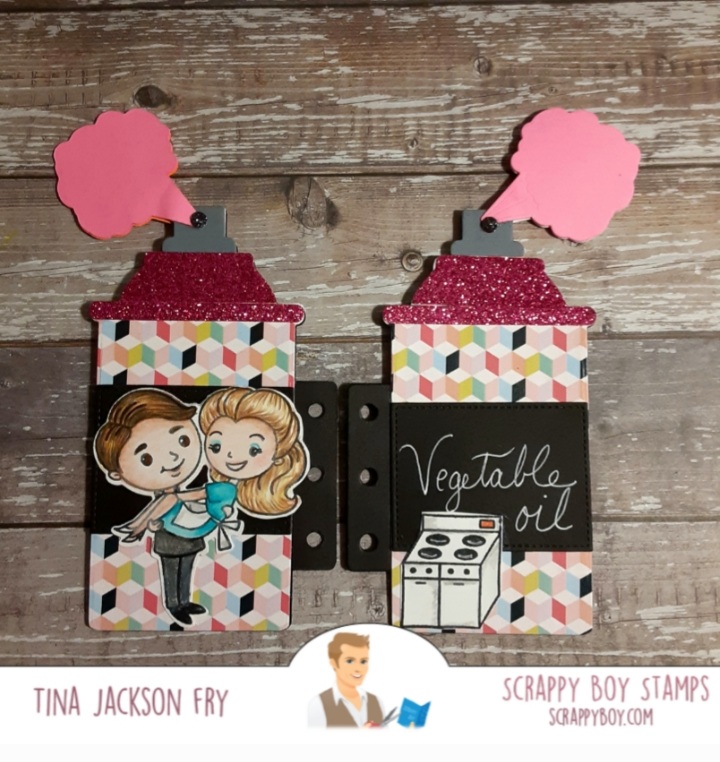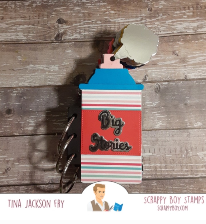 Hi! I had so much fun creating this mini album. So many possibilities with the spray can die set from Scrappy Boy Stamps. It is part of the new release going on. There are 3 new stamp. Hair Hopper, Permanently Punished, and Cute Girls I Love the 80’s matching dies are available too. Along with the can, here is a Boom Box die, stencils, and paper packs. Hope you check out the Scrappy Boy Stamps Inspiration Group page on Facebook and Instagram. I colored the images with Prisma Premier Pencils. You can click on the link to find Scrappy Boy Stamps. https://scrappyboy.com/Front of mini album. The die set hs some cool sentiments.To make the pages sturdier, I layered on both sides of the base page.Front and back covers.