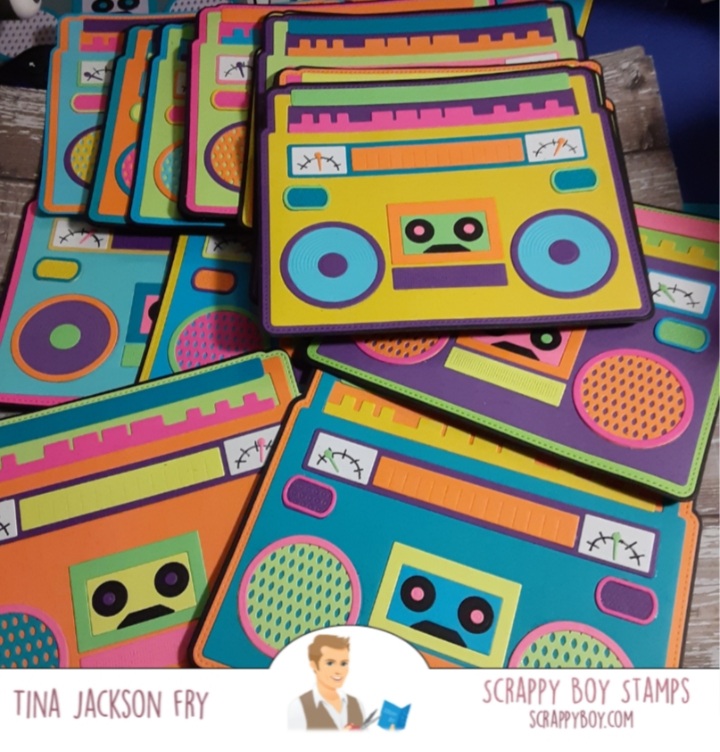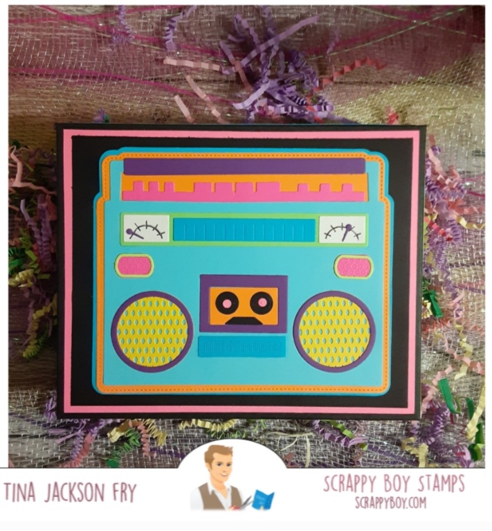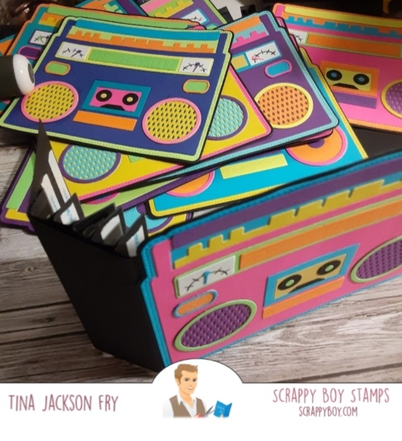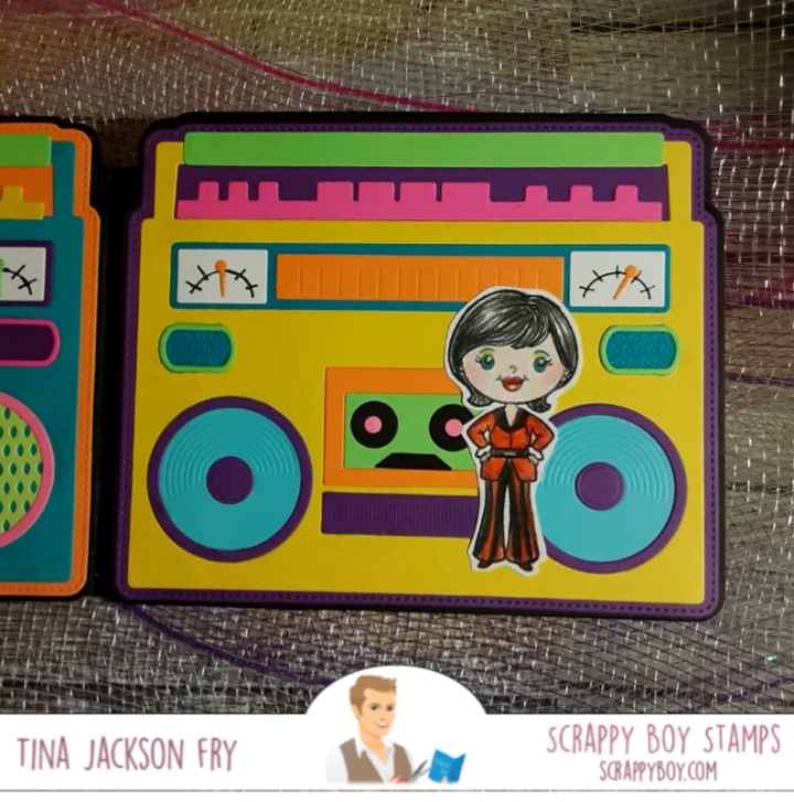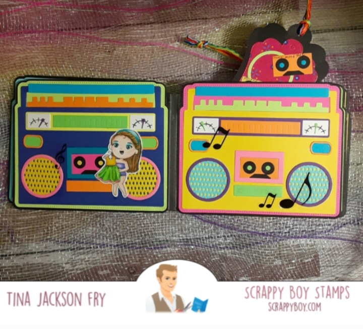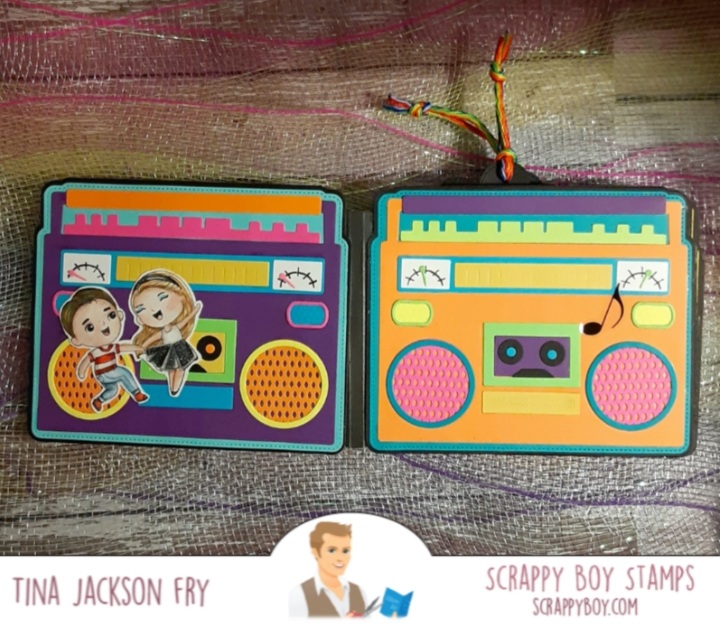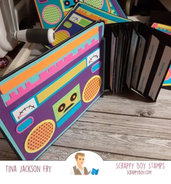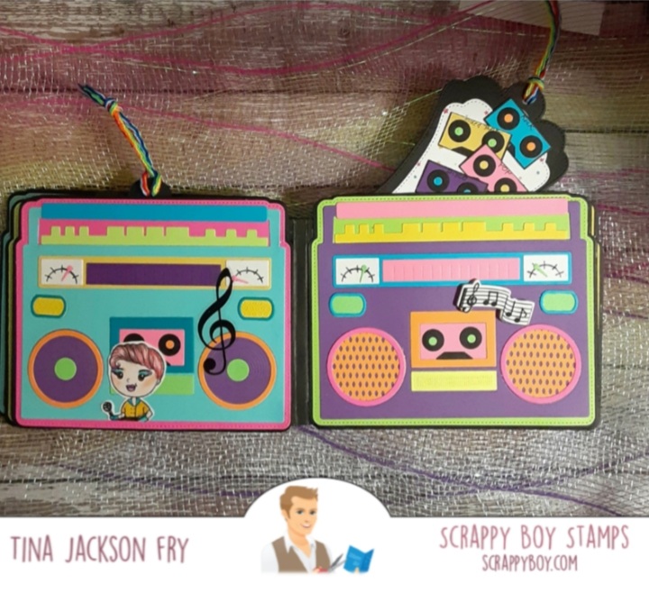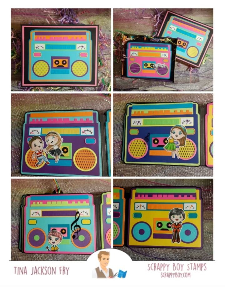 Hi, I’m sharing a Boom Box mini album with a gift box. All the stamps and dies are from Scrappy Boy Stamps. I had fun creating all the colorful pages. You can join the fun on Facebook with the Scrappy Boy Stamps Inspiration Group page, he is also on Instagram. Images were colored with Prisma Premier Pencils. To find Scrappy Boy Stamps you can click on the link https://scrappyboy.com/Cover of the gift box. Album inside the box on top of the lid.Front cover of the album Page 1 …..some of the pages are only glued on 3 sides leaving the top open for a pocket. Tags / bookmarks are n the pocket .