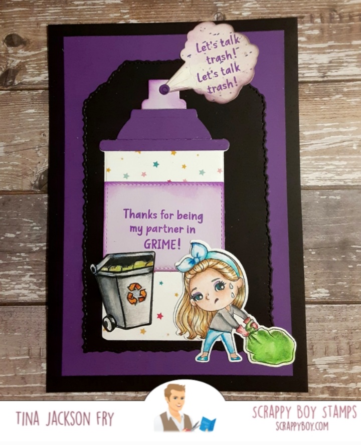 Hi today I’m sharing a card featuring an image from the Cute Girls Chores stamp set and the new spray can die from Scrappy Boy Stamps. Colored with Prisma Premier Pencils. The Cute Girls have matching dies and coordinating paper packs available too. You can join the fun on Facebook and Instagram with the Scrappy Boy Stamps Inspiration Group. To find the dies and more fun Scrappy Boy products you can click on the link. https://scrappyboy.com/collections/card-making-dies