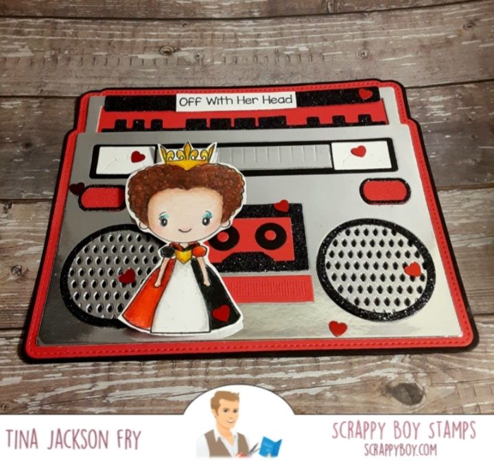 Hello! Today I’m sharing a card featuring an image from Off with their Heads from Scrappy Boy Stamps. The super cool Boombox Die is also from Scrappy Boy. She is colored with Prisma Premier Pencils. The possibilities with the Boombox are infinite. The design team has made so many cool projects with it. You can join the fun on Facebook and Instagram with the Scrappy Boy Stamps Inspiration Group. Click on the link to find Scrappy Boy Stamps https://scrappyboy.com/