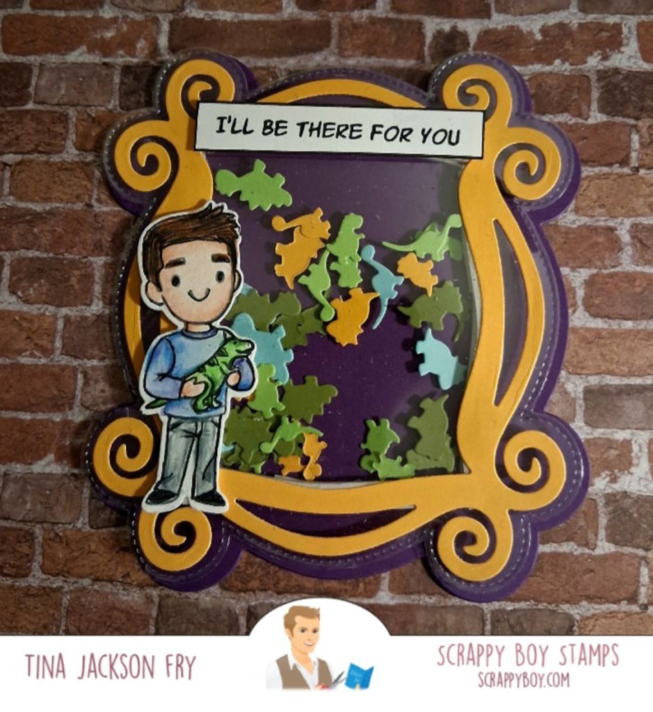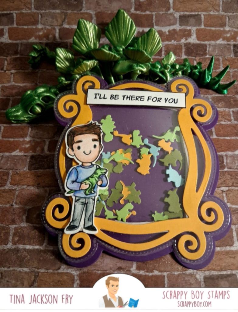Hi ! Today, I’m sharing a shaker card featuring an image from the Scrappy Boy Stamps set. I’ll be there for you . It also used the dinosaur shaker plate, and the picture frame dies. Colored with pencils. You can find Scrappy Boy Stamps Inspiration Group on Facebook. To find the products, you can click on the link. https://scrappyboy.com/The shaker bits from the plate are amazing! The shaker plates cut easily.