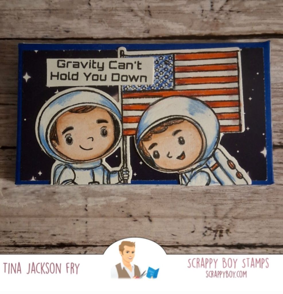 Hello! The Scrappy Boy Stamps release is going on. New stamps are The Queen, The Author, Fancy Shops, Moon Landing, Cute Kids Theme Park, and a 6×6 Theme Park background. Paper packs and pre colored dies are also available . New dies are Dearest Gentle Reader, Mouse Bumper Car, Moon Scene Builder, Backpack, Mouse Backpack add-on, and 3 mini album pockets. This card features images from the Queen. The design team has created amazing projects throughout the release that you can see on Facebook with the Scrappy Boy Stamps Inspiration group. To find the release, you can click on the link. https://scrappyboy.com/The Author colored with pencils. Moon Landing. I thought it would be fun to make a party favor boxes. Colored with pencils. Close up Back of the box, I love the coordinating paper. I rounded the corners on the flap.This is one of the 3 new pocket dies. The sentiment and paper are also available in the Scrappy Boy shop.