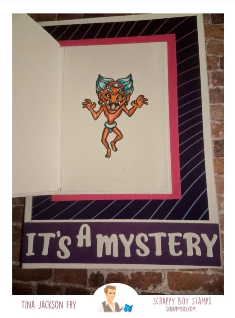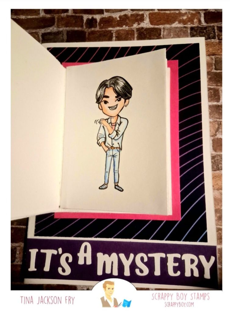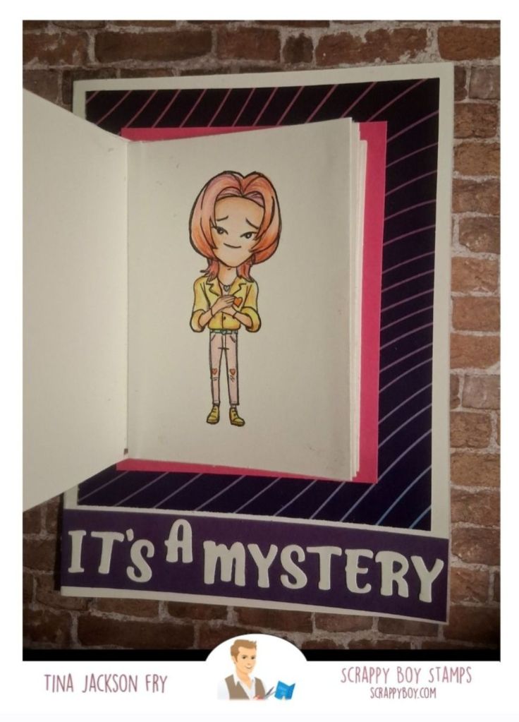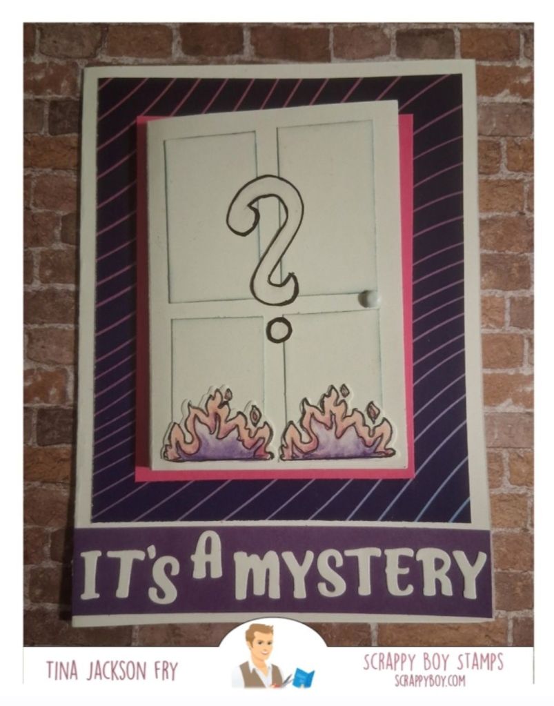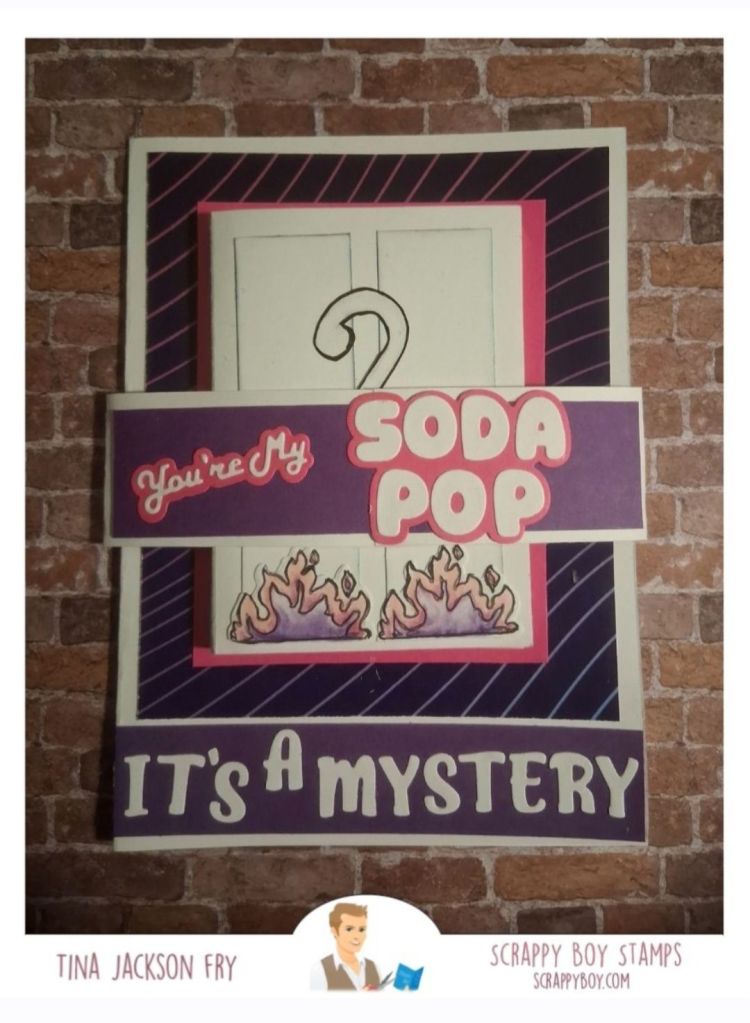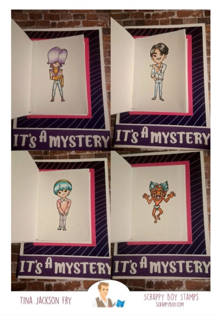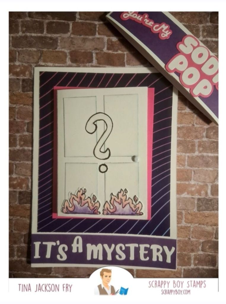 Hi, today I’m sharing some projects from the Scrappy Boy Stamps new release. New stamp sets are Stage Slayers, Harmony in the Dark, Ham it Up, Beyond the Normal, The Other Side, and Beyond the Normal Living Room. Paper packs and pre colored dies are also available. New dies are a Ramen Cup, You’re my Soda Pop Can, Walkie Talkie, Shabubu Head mini album, Mouse Ears alphabet numbers, Honey Bear Backpack add-on, Maleficent Backpack add-on, and a 3d Blind box. The design team has created so many fabulous projects you can check out on the Scrappy Boy Stamps Inspiration group on Facebook. To find the release you can click on the link. https://scrappyboy.com/I made this card thinking of a favorite childhood game. I drew and cut out the question mark for the door. I thought it would make a super fun card. I made a belly band to hold the pages of the card in place.I love the flames on the bottom of the door.I used the Scrappy Boy alphabet dies Colored with Prisma Premier pencils The last page on the cardAll of the pages I really had fun creating with Beyond the Normal and the Other Side stamps Beyond the Normal Living Room, colored with pencils