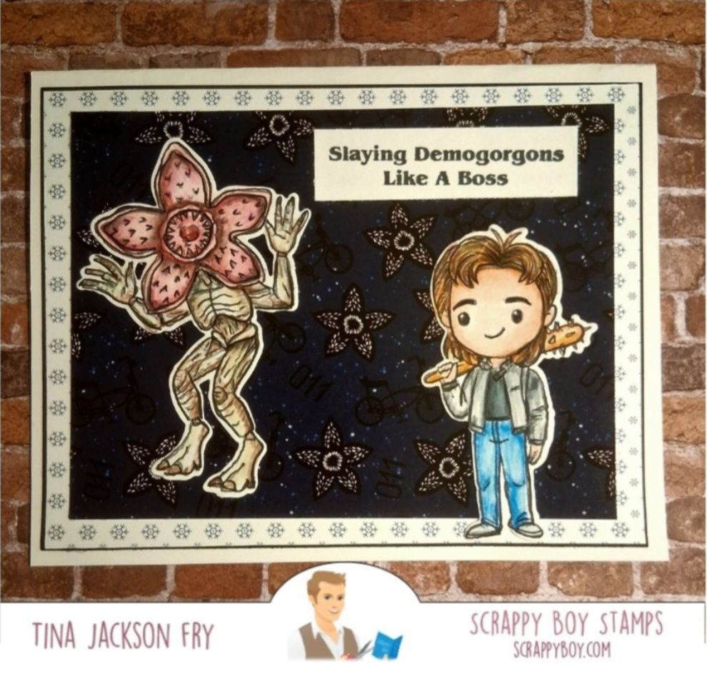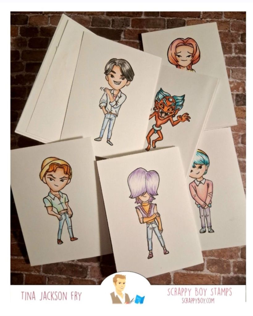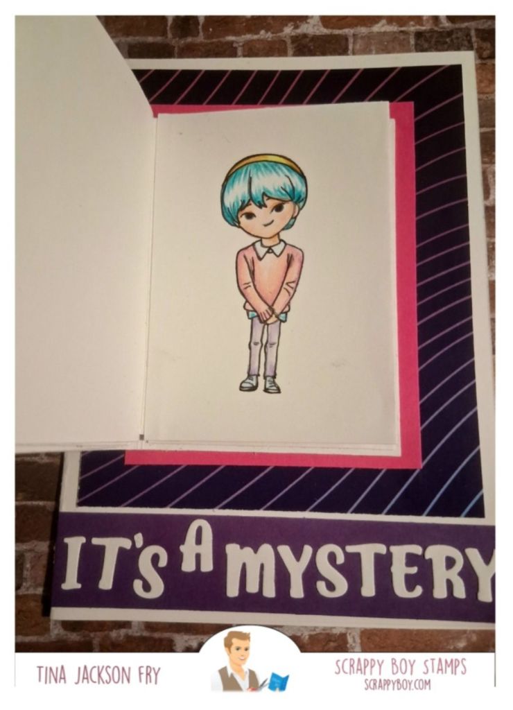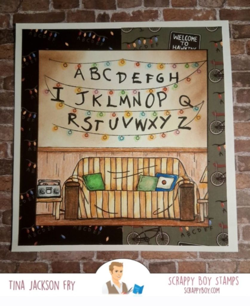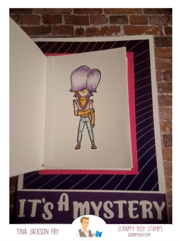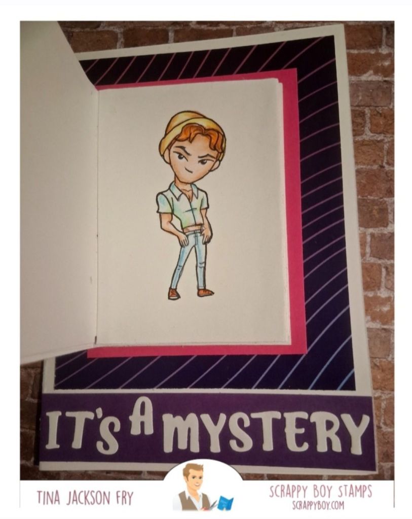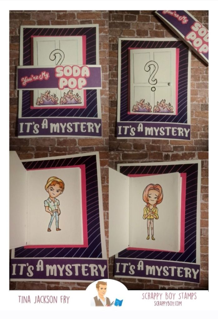 Hi, today I’m sharing some projects from the Scrappy Boy Stamps new release. New stamp sets are Stage Slayers, Harmony in the Dark, Ham it Up, Beyond the Normal, The Other Side, and Beyond the Normal Living Room. Paper packs and pre colored dies are also available. New dies are a Ramen Cup, You’re my Soda Pop Can, Walkie Talkie, Shabubu Head mini album, Mouse Ears alphabet numbers, Honey Bear Backpack add-on, Maleficent Backpack add-on, and a 3d Blind box. The design team has created so many fabulous projects you can check out on the Scrappy Boy Stamps Inspiration group on Facebook. To find the release you can click on the link. https://scrappyboy.com/I made this card thinking of a favorite childhood game. I drew and cut out the question mark for the door. I thought it would make a super fun card. I made a belly band to hold the pages of the card in place.I love the flames on the bottom of the door.I used the Scrappy Boy alphabet dies Colored with Prisma Premier pencils The last page on the cardAll of the pages I really had fun creating with Beyond the Normal and the Other Side stamps Beyond the Normal Living Room, colored with pencils
